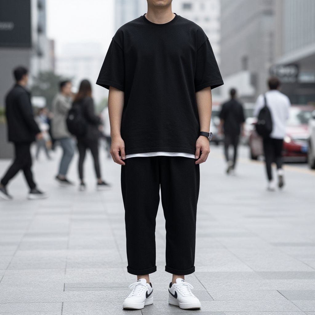 A minimalist streetwear outfit modelled by a European man, set in a minimalist urban environment with neutral tones and a focus on the clothing's design details, realistic photo style
