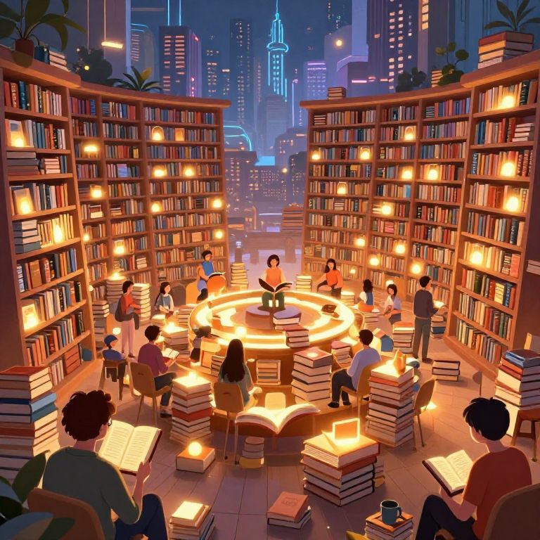 Wattpad concept art showing a vibrant digital library filled with glowing books and diverse readers interacting, futuristic cityscape background, warm tones, imaginative and inspiring atmosphere, detailed illustrations of storytelling in progress.