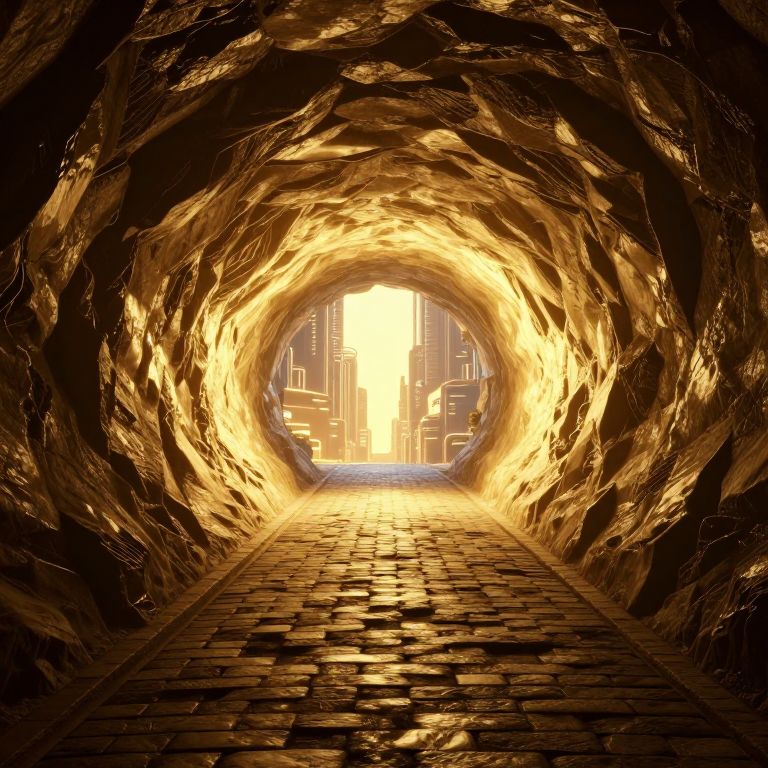 A computer-generated 3D render depicts a mesmerizing underground tunnel bathed in warm golden light, where cobblestone pathways lead towards a radiant exit, symbolizing the power of laughter as the source of illumination and life in this fantastical, cyberpunk-inspired cityscape.