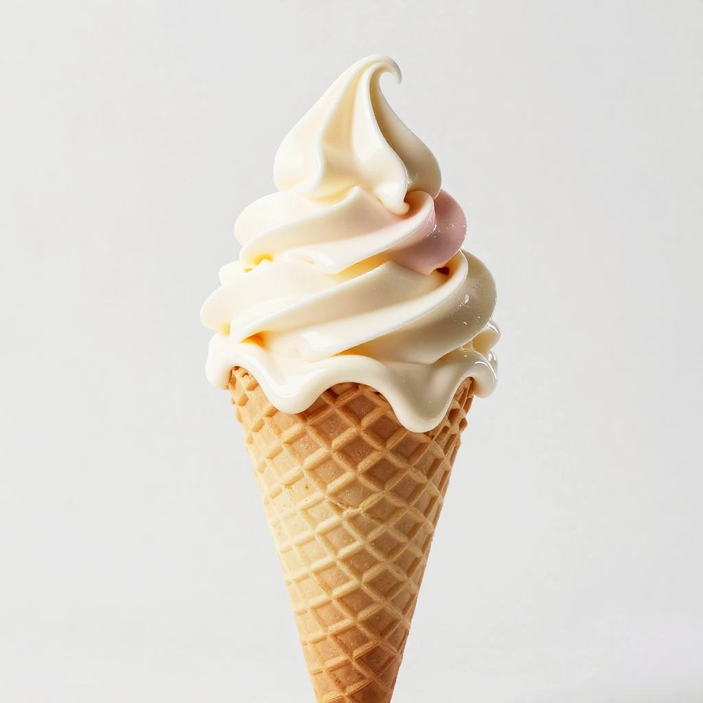 Photograph of a vanilla ice cream cone with swirled white and pink ice cream, set against a bright white background.