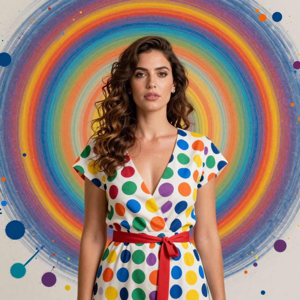 Photograph of a woman with wavy brown hair, wearing a white, short-sleeved V-neck dress adorned with large, colorful polka dots in red, blue, green, yellow, and orange. She has red lipstick and small hoop earrings. The background features a vibrant, swirling rainbow pattern with concentric circles in blue, green, yellow, orange, and red, accented by splatters of paint in matching colors. The woman's confident expression and the bright, playful design create a lively, energetic atmosphere. The image has a polished, digital art style.