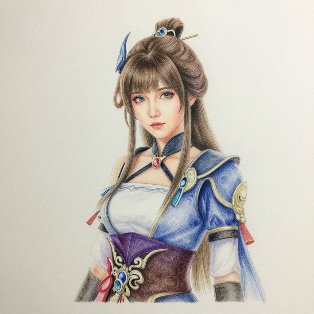 Full body portrait detailed colored pencil drawing of beautiful female cosplay with a beautiful face wearing intricately designed clothing, soft focus