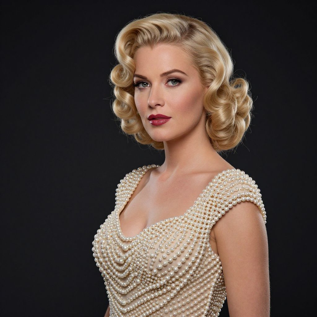 Elegant portrait of a woman with voluminous blonde curls styled in a classic retro fashion, wearing a pearl-adorned dress that exudes timeless glamour against a dark background.