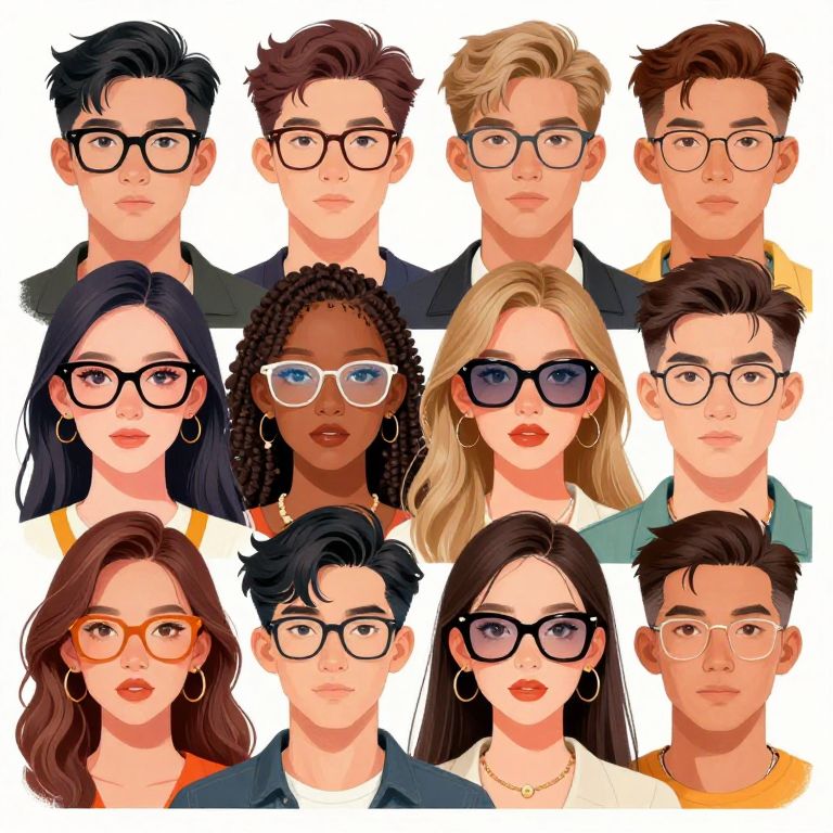 What glasses suit my face: a detailed illustration of a diverse group of face shapes with various stylish glasses fitting each shape perfectly, vibrant colors, modern fashion accessories, realistic yet artistic style, soft lighting highlighting features