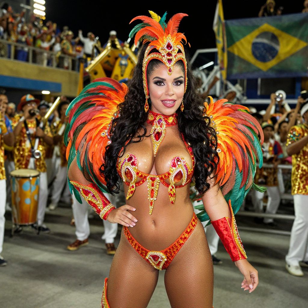 A vibrant woman costume featuring a Rio carnival showgirl in full samba glory, wearing a dazzling outfit with fiery red and gold sequins, flowing colorful feathers cascading down her back and arms, glowing under stage lights in a bustling Carnival parade setting with vibrant Brazilian music and crowds in the background; she has bold, expressive features with bright brown eyes, a smoky cheeky smile, and long wavy black hair styled with gold accents, standing on a polished stage with a traditional samba drum backdrop.. The woman has big tits and cute face