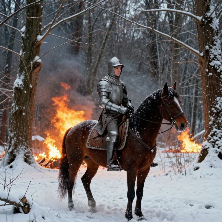 Photograph of armored knight in silver armor riding a dark brown horse, amidst a forest fire, with snow-covered ground and trees.