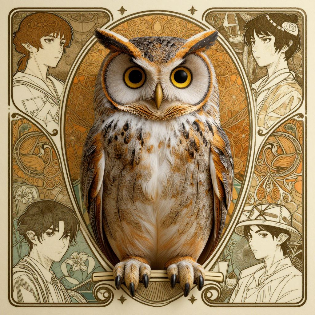 Cute owl, organic, epic, baroque art nouveau, manga, james jean, mucha, yoshitaka amano, photorealistic rendering, 3 ds max + v - ray, extremely detailed and complex, center composition, elegant, vfx, unreal engine 5, octane rendering, very contrasting, very sharp lines