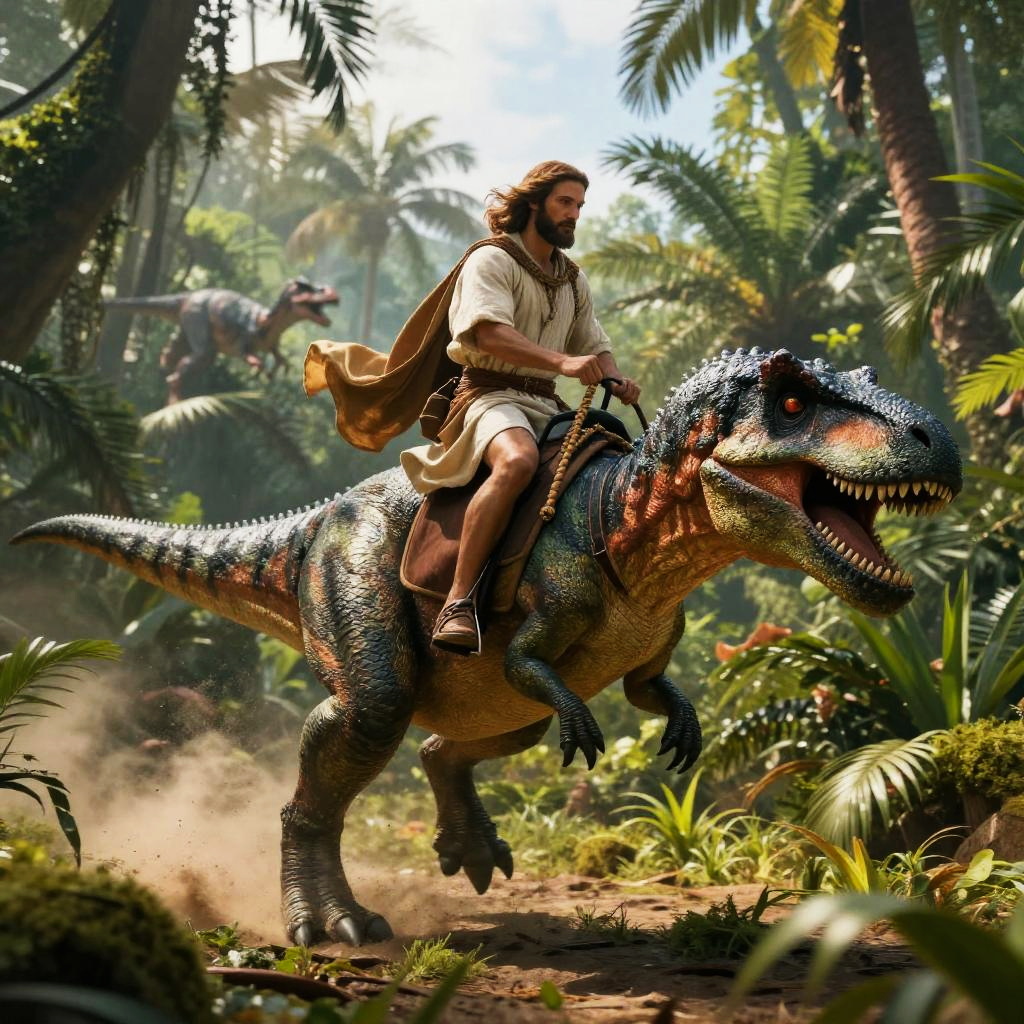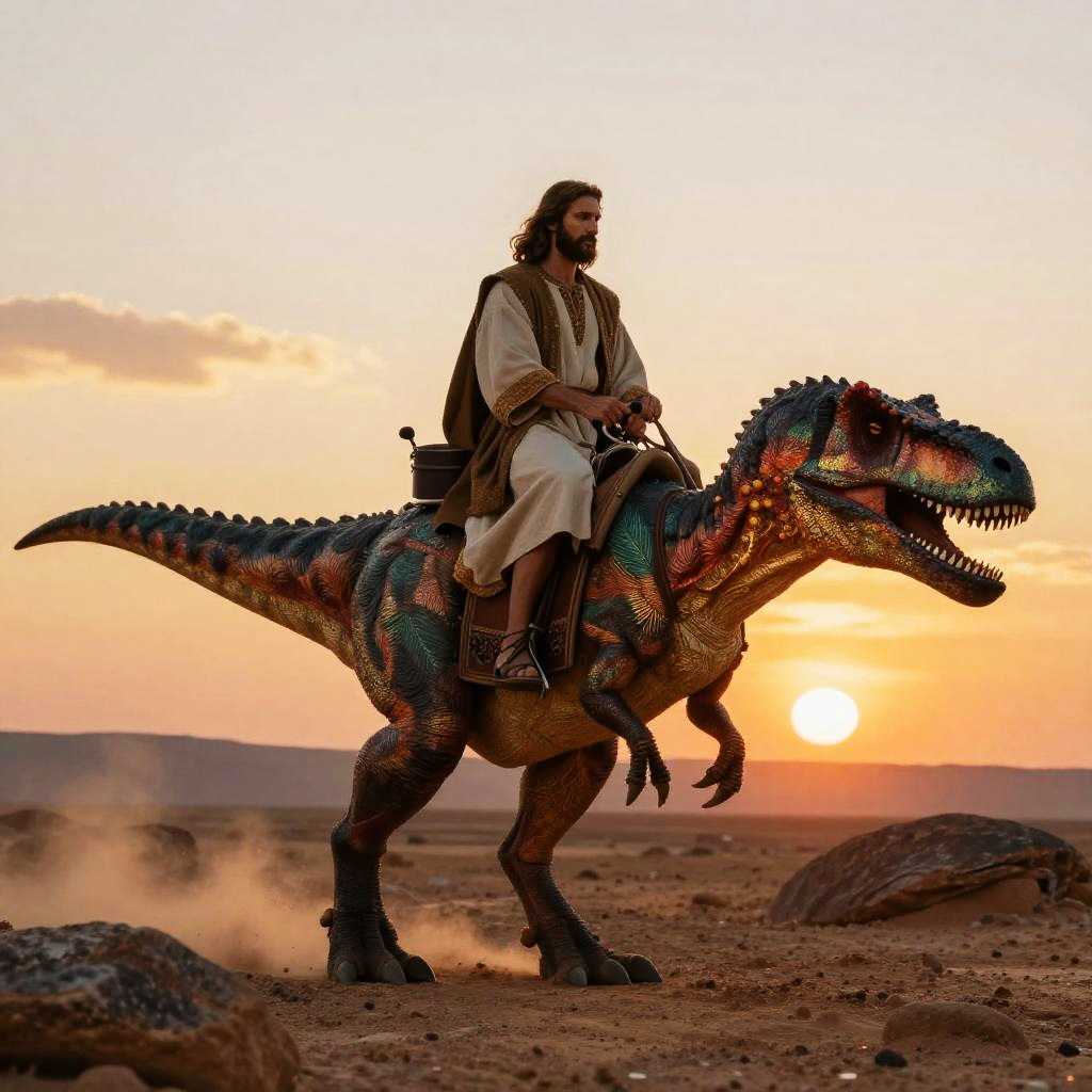 Jesus Riding Velociraptor in Storm