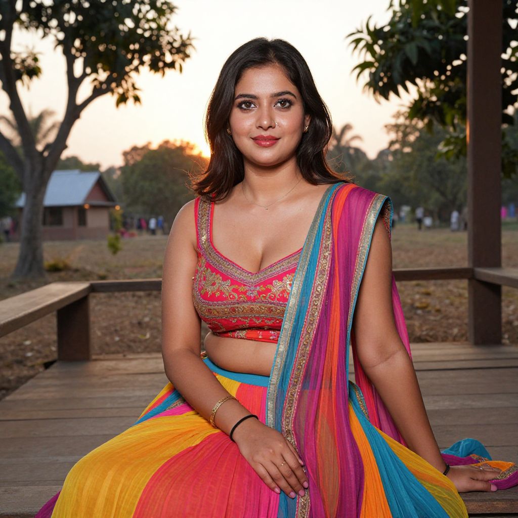 A beautiful Indian woman with smooth, fair skin, warm brown eyes, and a natural red lip, wearing a vibrant georgette ghagra costume, seated on a traditional wooden veranda in a rural Indian village during sunset, with mango trees in the background and a faint golden glow from the setting sun.. The woman has big tits and cute face