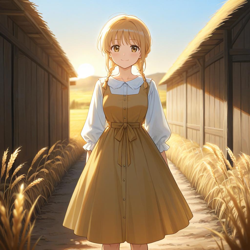 Illustration of a young girl with blonde braided hair wearing a brown country-style dress with a white blouse underneath, standing between rustic wooden barns. The setting is a farm with golden wheat fields, illuminated by warm golden hour sunlight and a clear blue sky. The image has a soft, gentle atmosphere with a shallow depth of field and soft bokeh, evoking a nostalgic, old-school 35mm film photography effect.