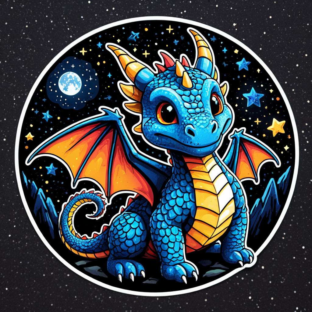 Stone: Cute, colorful, realistic depiction of a majestic dragon in a fantasy style. Includes electric colors and medium level of detail. Created as a sticker with a thick black outline and starry night background.