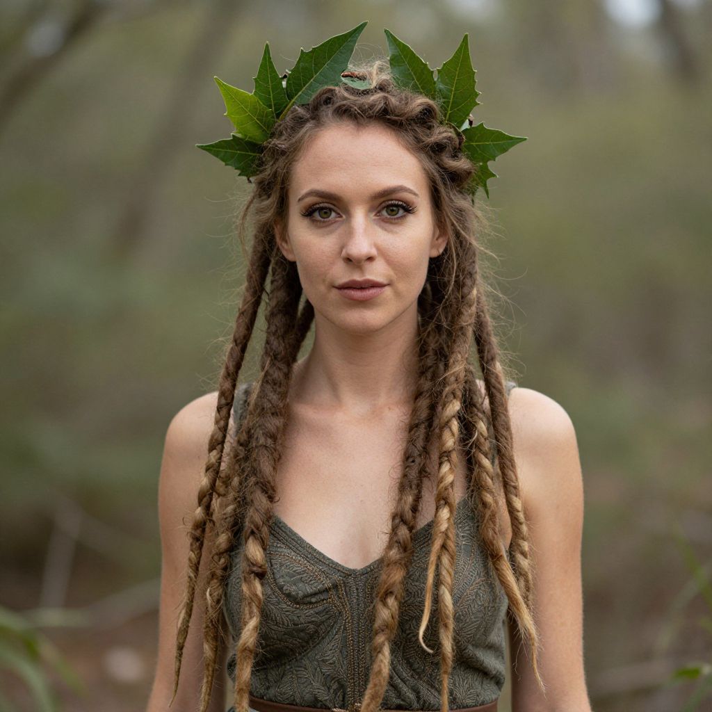 Photograph of a young white woman with light skin and slender build standing in a blurred forest background. She has long, thick dreadlocks with light brown and dark brown strands, adorned with a green leaf crown. She wears a sleeveless, dark green, textured dress. Her expression is neutral, with light makeup highlighting her eyes. The natural light enhances the earthy tones, creating a woodland, nature-inspired aesthetic. The focus is on her upper body, with the background softly out of focus.