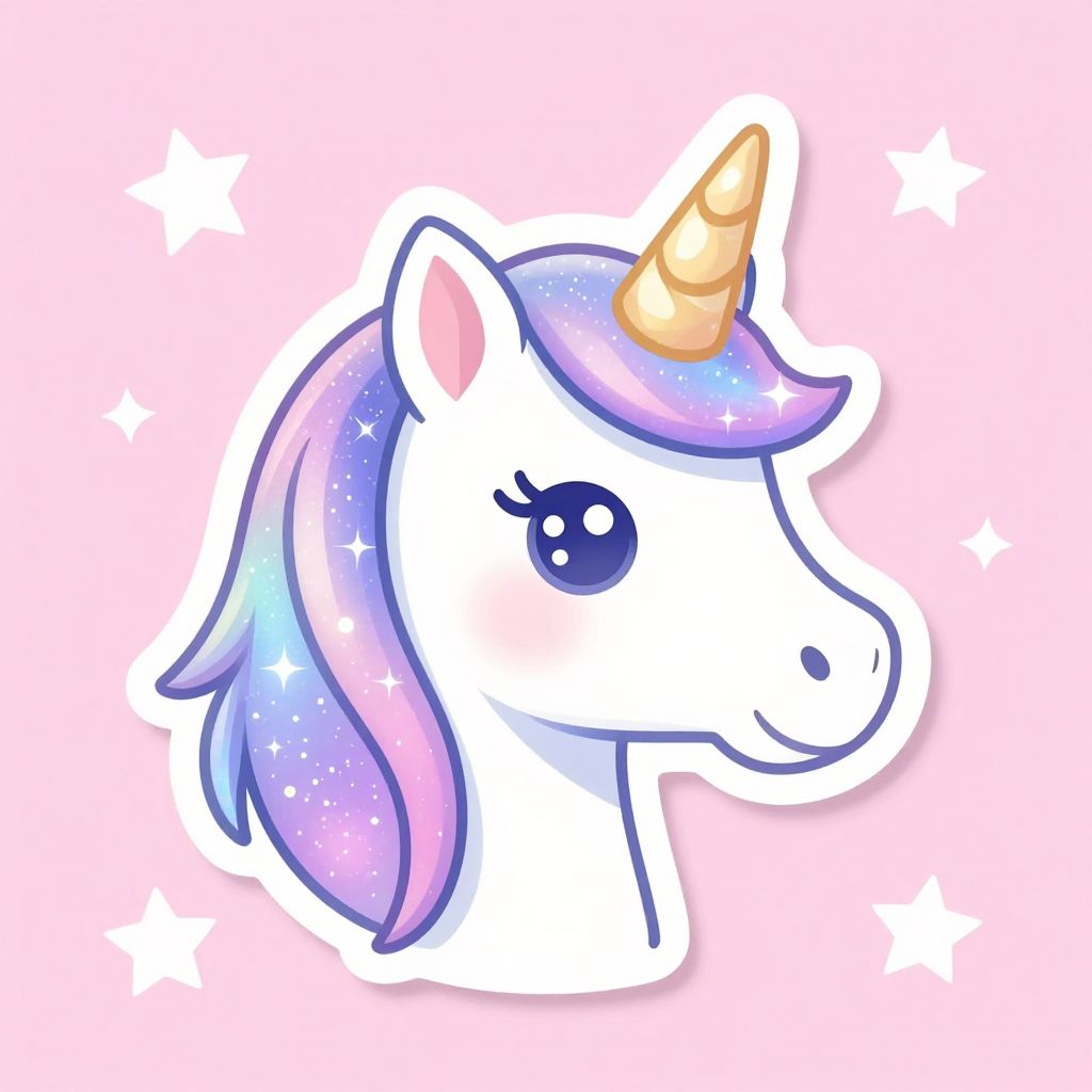 A digital illustration of a cute, white unicorn's head with a pastel purple and blue starry mane, and a golden horn. The unicorn has large, expressive blue eyes with long lashes and a small, friendly smile. The background is pink with white, sparkly stars. The style is whimsical and cartoonish with bright, cheerful colors and a glossy finish. The unicorn's head is outlined in white, giving it a sticker-like appearance.