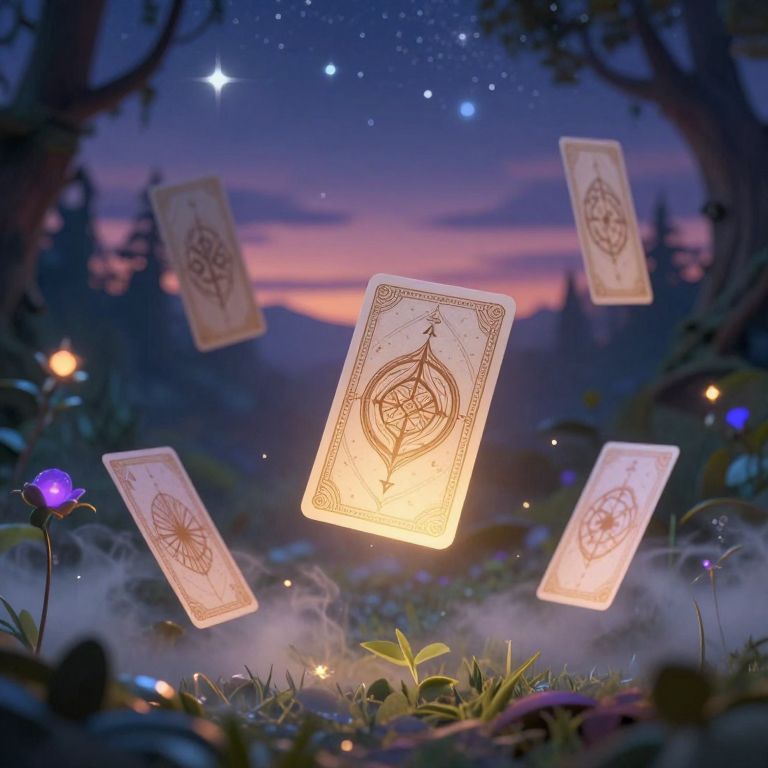 A magical scene featuring cartas floating mid-air, glowing softly against a twilight sky filled with stars, each card etched with arcane symbols, surrounded by swirling mist and enchanted forest elements.