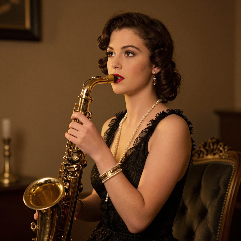 Vintage-style photograph of a fair-skinned woman with dark, wavy hair playing a golden saxophone, wearing a black, sequined dress and red