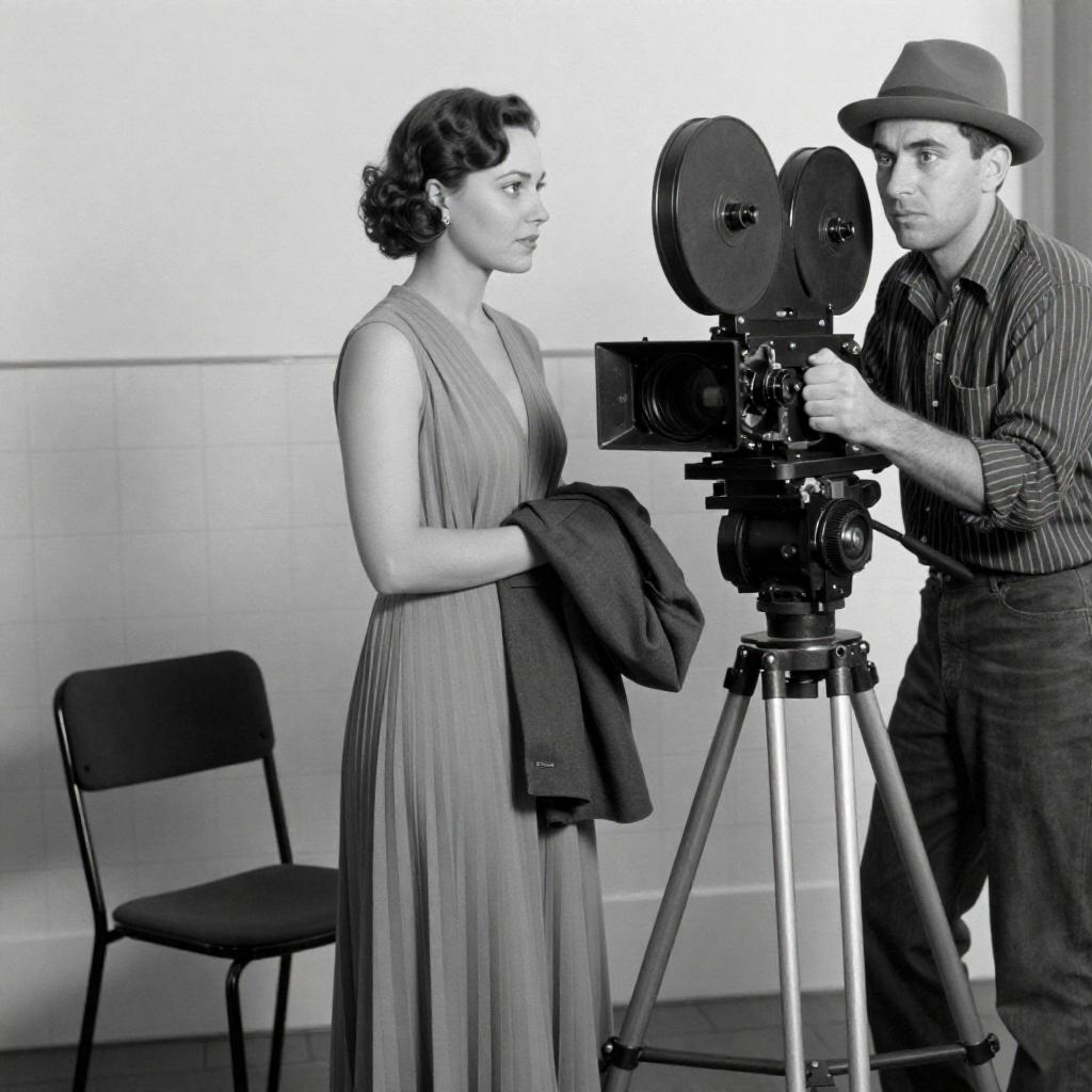 Black-and-white photograph of a woman in a long, pleated dress with a dark jacket draped over her arm, standing next to a man operating a large film camera. The man wears a hat and a striped shirt. Studio setting with tiled walls, chair, and film equipment. Woman looks to the right, man looks at the camera. Intense expressions not visible.