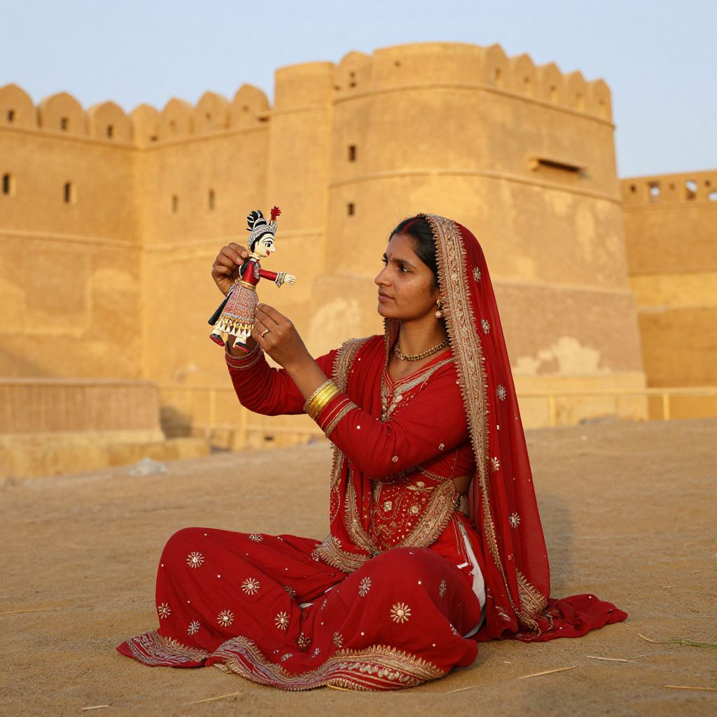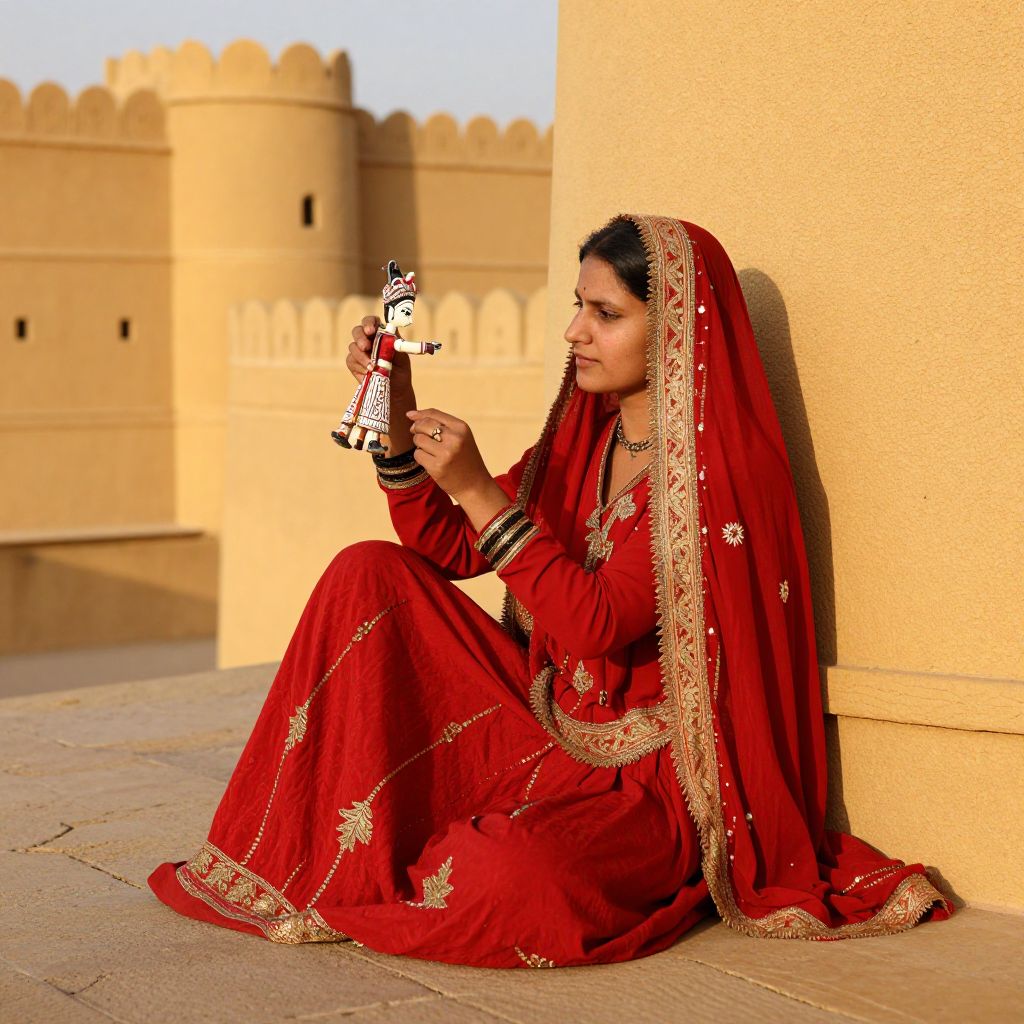 Amidst the golden hues of Jaisalmer's ancient fort walls, a woman sits with quiet resilience, her vibrant red attire and delicate puppet embodying the timeless dance between tradition and change, while the whispers of the desert breeze carry stories of endurance and cultural heritage.