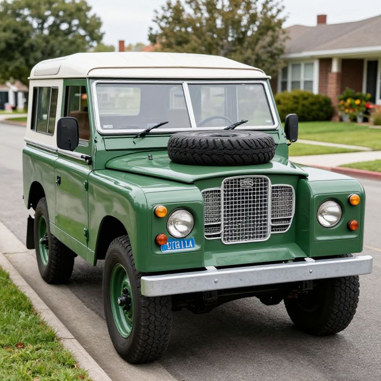 Photograph of a green classic Land Rover with white roof, black spare tire on the roof, parked on a suburban street.
