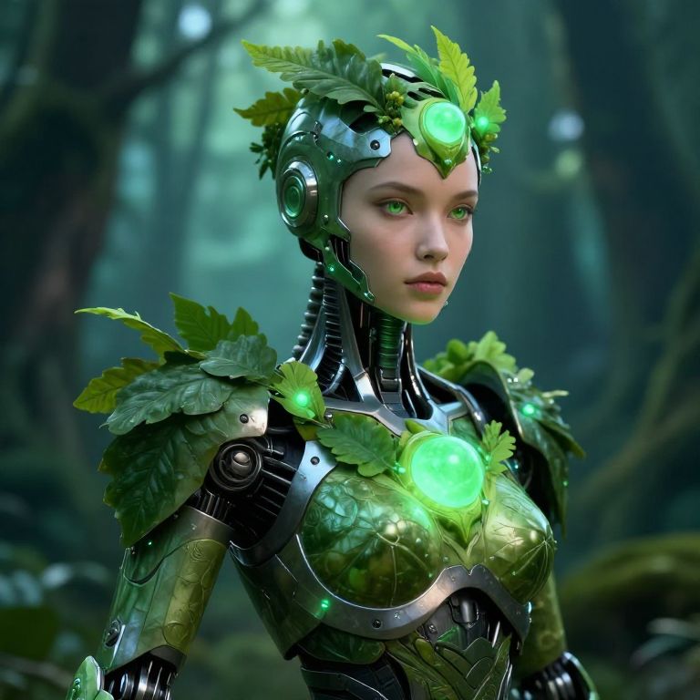 A digital artwork of a female android with a nature-themed design. The android features metallic armor and green glowing elements, blending technology with organic plant motifs. The headpiece and chest area are adorned with lush green leaves and glowing spheres, set against a mystical forest background.