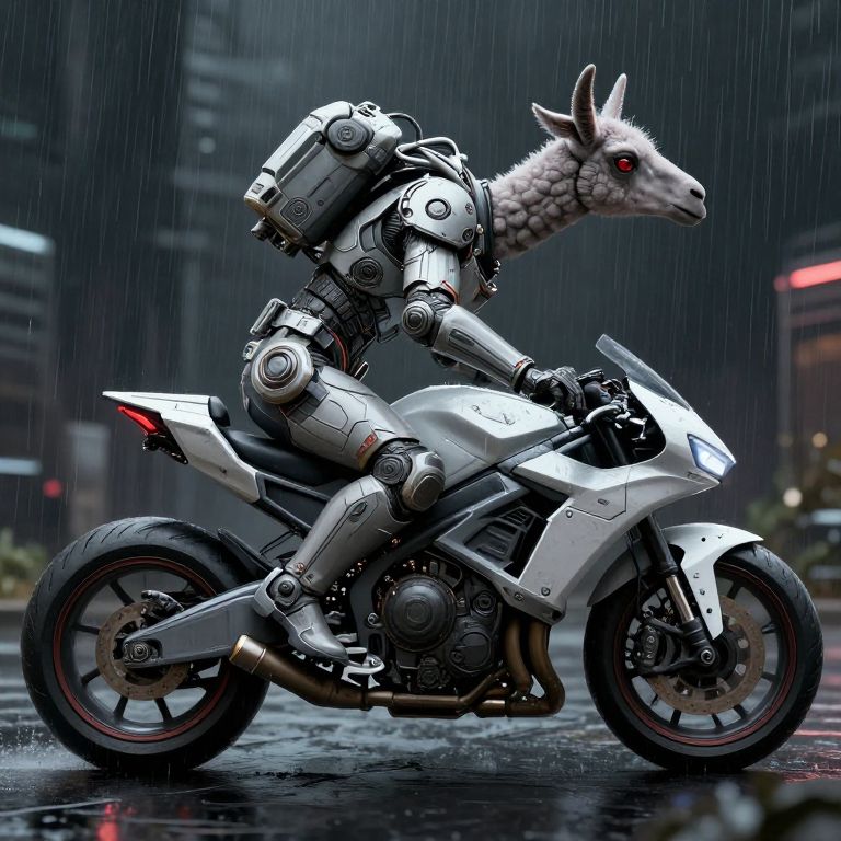 A futuristic cyber llama with a robotic humanoid body wearing hardsurface armor, riding a sleek sci-fi motorcycle in a rainy cyberpunk city environment. The llama has glowing red eyes and realistic fur detail, situated in a dynamic pose with cinematic lighting and hyperrealistic textures.