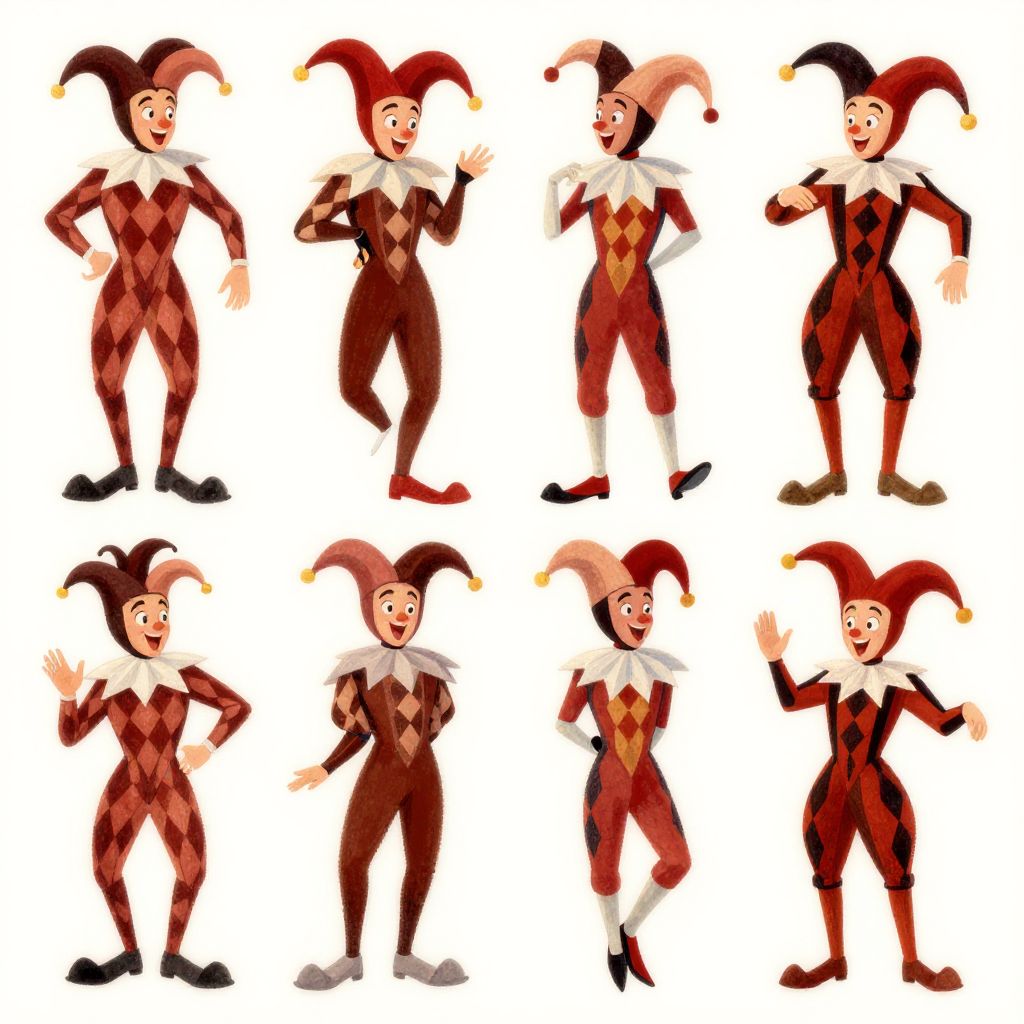 Arlecchino character sheet art presenting multiple outfit variations of the classic jester costume with diamond patterns, exaggerated facial expressions, and lively stances, combining traditional hand-painted textures with modern digital illustration techniques.