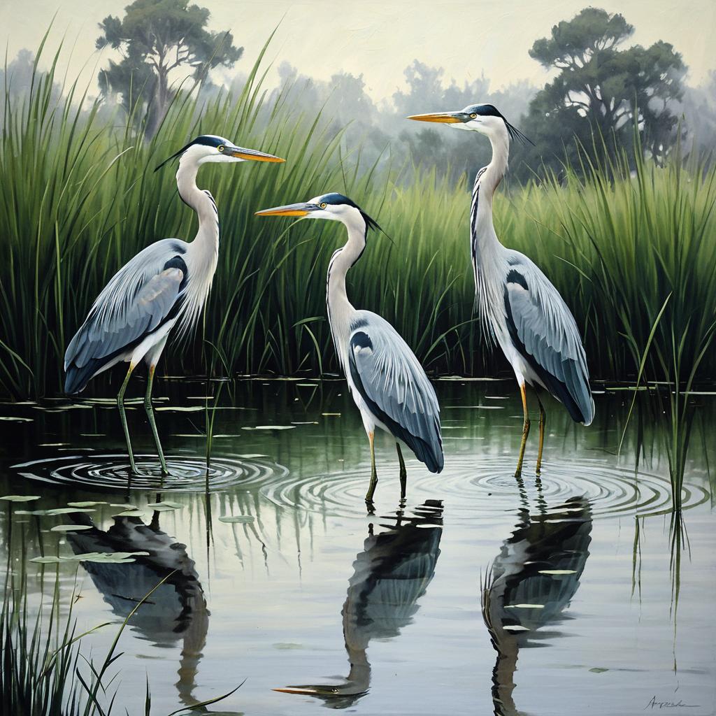 Hyperrealistic oil painting of a group of graceful herons in a pond, muted tonality, large-scale abstract style, inspired by California Impressionism, light gray and green tones, majestic, atmospheric