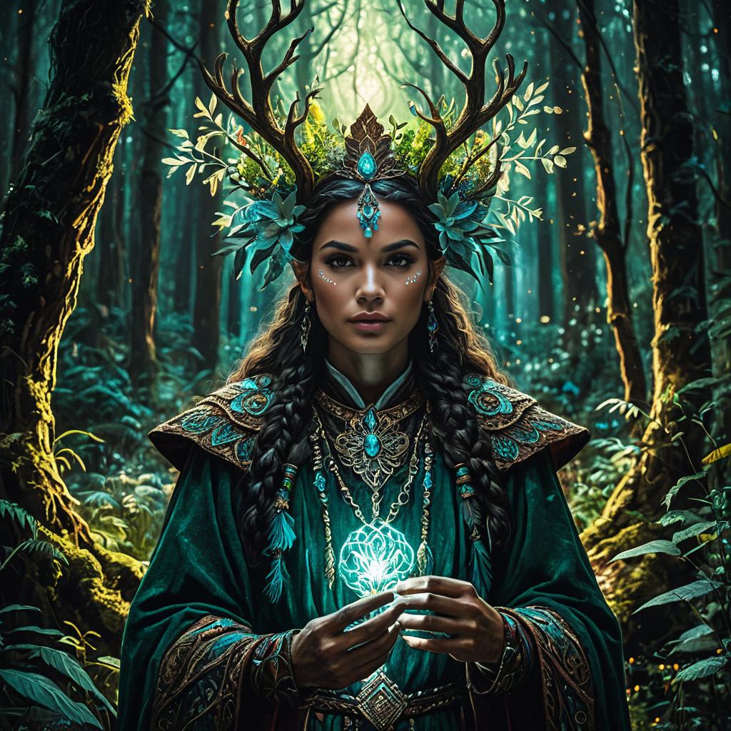 Closeup portrait of mystical forest elf queen wearing an ornate outfit, posed in ancient enchanted woodland, rendered in digital fantasy painting with vibrant colors, ultra-detailed textures, dramatic lighting, trending on ArtStation.