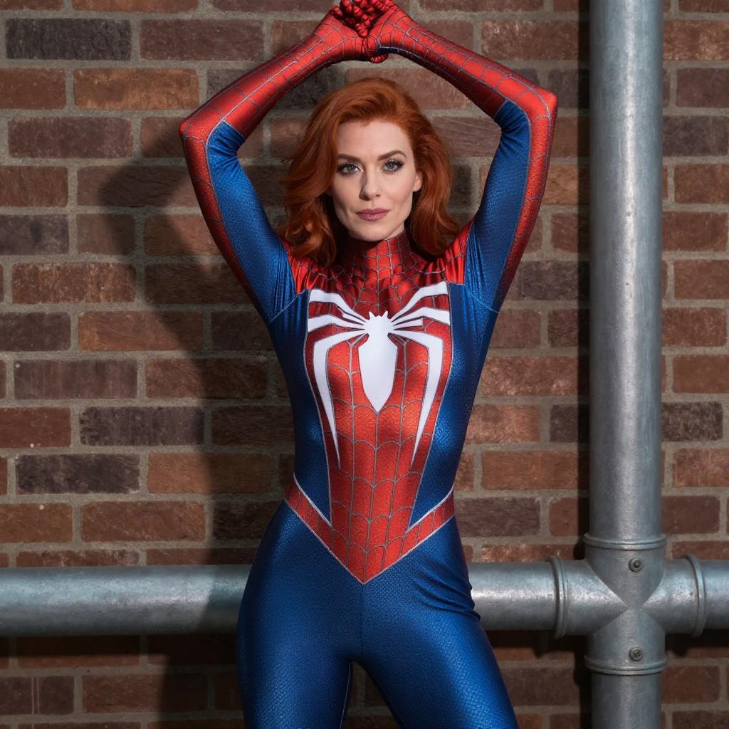Photograph of a red-haired woman in a tight, shiny red and blue Spider-Man costume with a white spider emblem, standing against a brick wall with large metal pipes. She has her arms raised above her head, striking a confident pose. The costume highlights her curvy figure and the metallic ure of the pipes contrasts with the brick background.