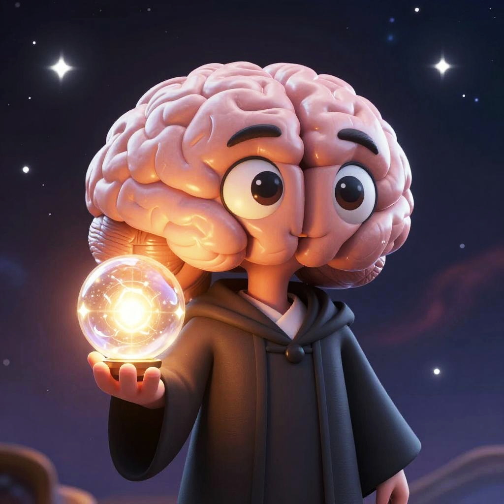 Intelligent cartoon brain character with animated features, wearing a scholar's robe and holding a glowing orb of knowledge, set against a cosmic background of stars and nebulae, emphasizing wisdom and curiosity.