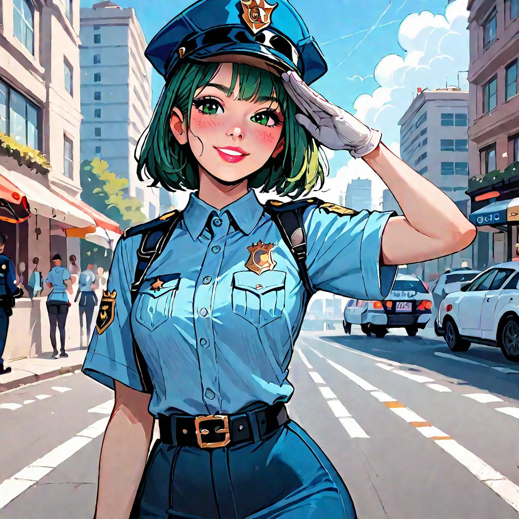 Score_9, score_8_up, score_7_up, score_6_up, source_anime, green hair, blue hat, police uniform, blue shirt, short sleeves, belt, pencil skirt, white gloves, looking at viewer, happy, city, salute, blue sky, upper body