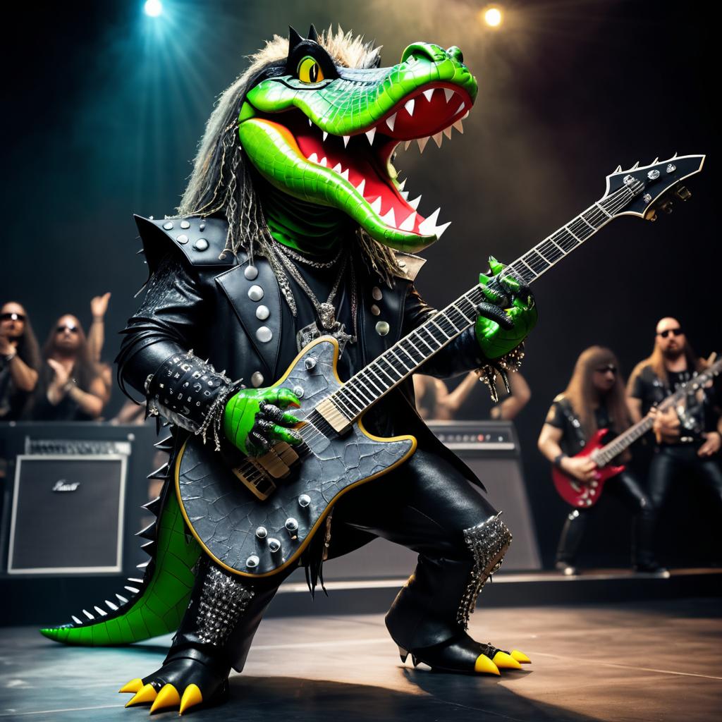 Anthropomorphic alligator dressed as a heavy metal rock star, playing guitar on stage before a headbanging crowd, dark and photorealistic.