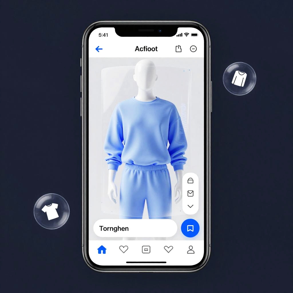 Photograph of a smartphone displaying a blue-toned mannequin in a sweatshirt and pants, with two circular app icons on a dark blue background