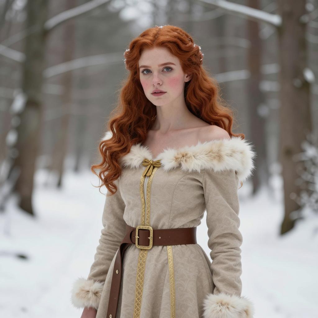 Photorealistic portrait of a red-haired woman with fair skin and long wavy hair, dressed in a medieval-style winter dress. The beige off-shoulder dress features gold trim, a brown belt with a gold buckle, and fur trim on the sleeves and collar. She stands in a snowy forest with snow-covered trees in the background. The image captures soft natural light, a slight blush on her cheeks, and a serious expression, emphasizing natural beauty and intricate clothing details.