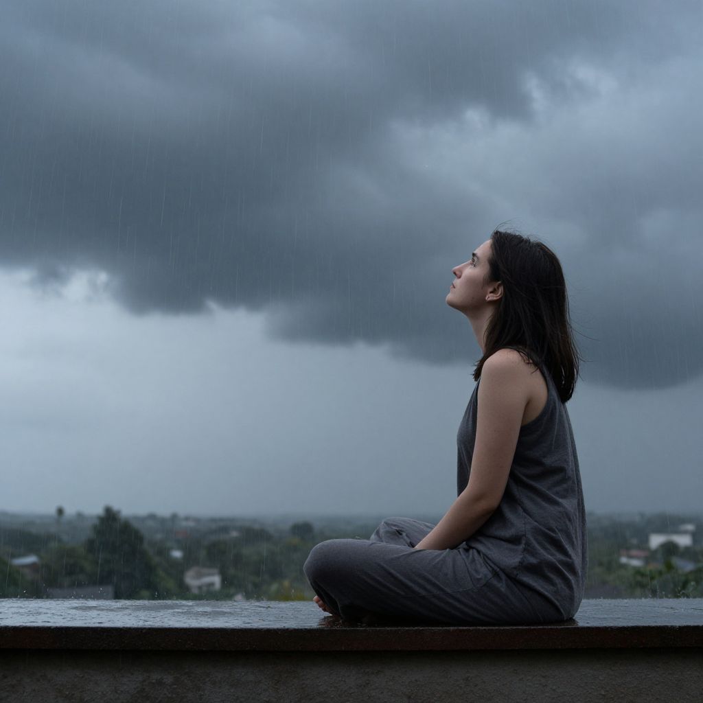 Photograph of a young woman with medium-length dark hair, sitting cross-legged on a wet, gray concrete ledge. She is wearing a gray sleeveless top and matching pants. She gazes upward with a contemplative expression, her face tilted slightly back. The background features a stormy, overcast sky with dark, heavy clouds and rain visible. The horizon shows a distant, blurred landscape with greenery and scattered buildings. The overall mood is somber and reflective, emphasized by the cool, muted colors and the rainy atmosphere. The woman's skin tone is light, and her physique is slender.