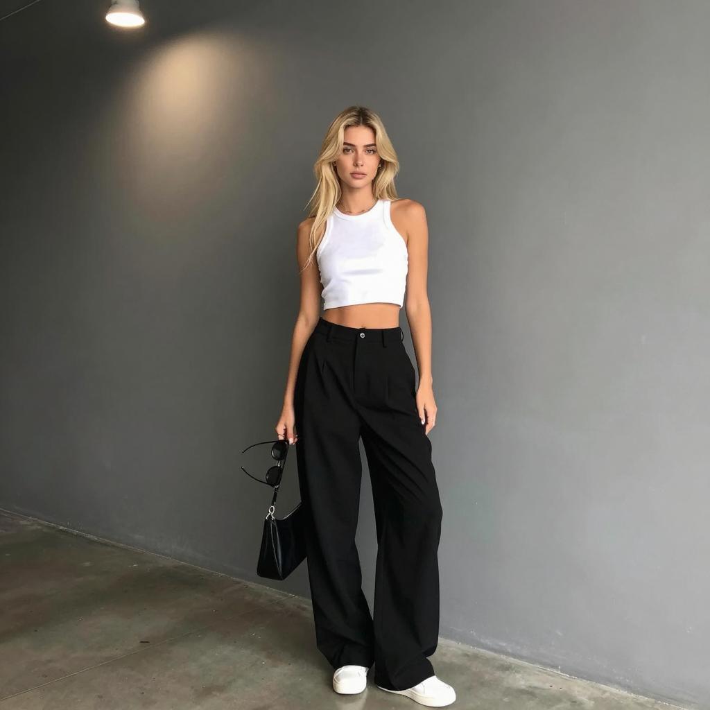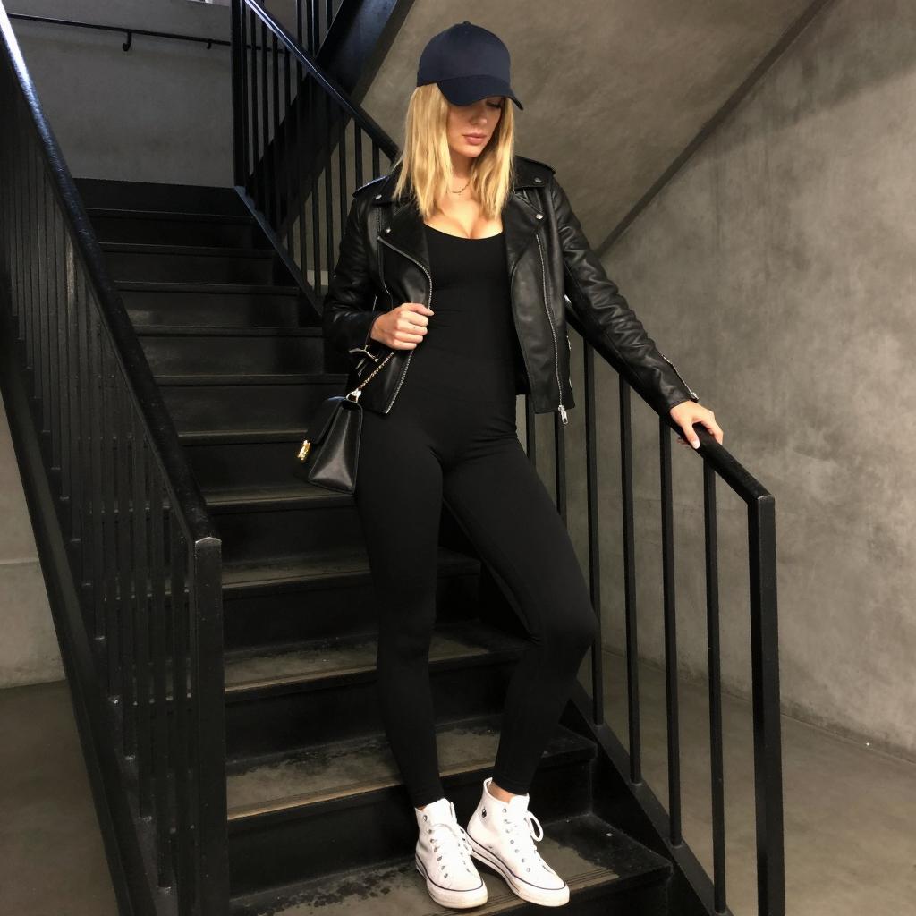 Woman with long blonde hair in navy baseball cap, black leather jacket, black high-waisted leggings, white sneakers, standing by black metal railing. Background: white and black wall, black door. Holding small black purse in left hand, right hand on railing. Indoor setting.