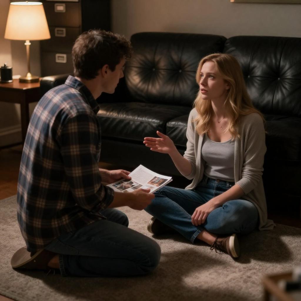Photograph of two people in a dimly lit room. Man with short brown hair, wearing plaid shirt, kneels on carpet. Woman with blonde hair, wearing gray tank top and cardigan, sits on floor, gesturing. Black leather couch behind them, orange lamp on side table to left. Man holds magazine, woman looks at him. Warm light casts shadows. Carpeted floor, filing cabinet in background. Intimate, serious interaction.