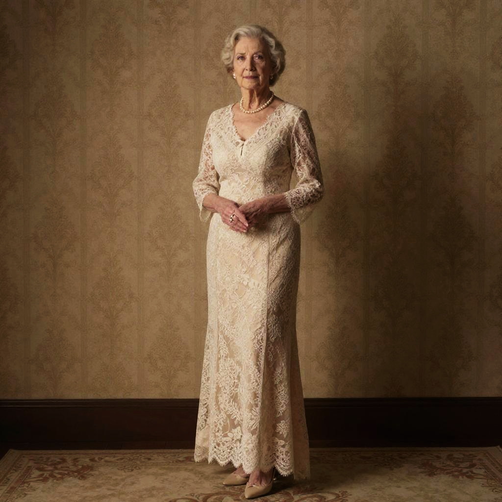 Full-length portrait of an elderly woman wearing a vintage beige lace gown and pearl necklace, standing against an ornate vintage wallpaper. The warm ambient lighting highlights her poised and sophisticated demeanor, evoking timeless elegance.