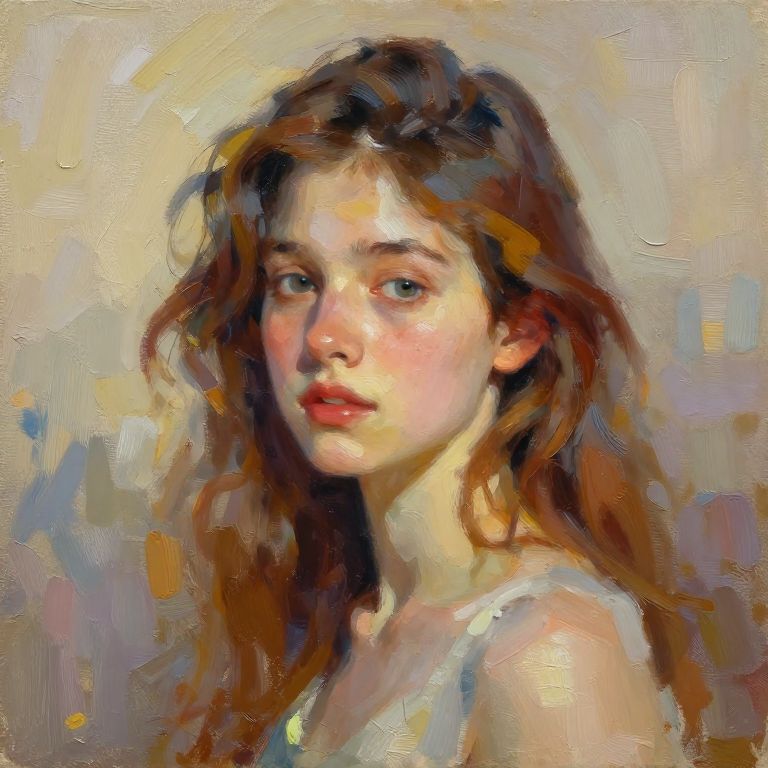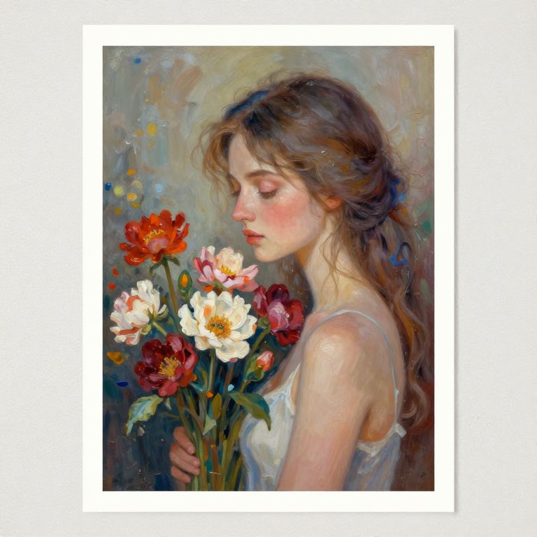 This is a digital painting of a young woman with fair skin and long, wavy brown hair, holding a bouquet of vibrant flowers. She wears a white, sleeveless top and gazes softly downward at the blooms. The flowers include red, orange, and white dahlias with green stems and leaves. The background is a blend of soft, muted colors, creating a serene atmosphere. Her profile is turned to the right, and her expression is peaceful. The painting style is realistic with delicate brushstrokes and a dreamy, romantic feel. The image is framed with a white border.