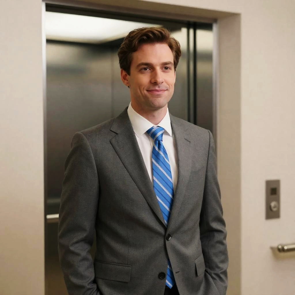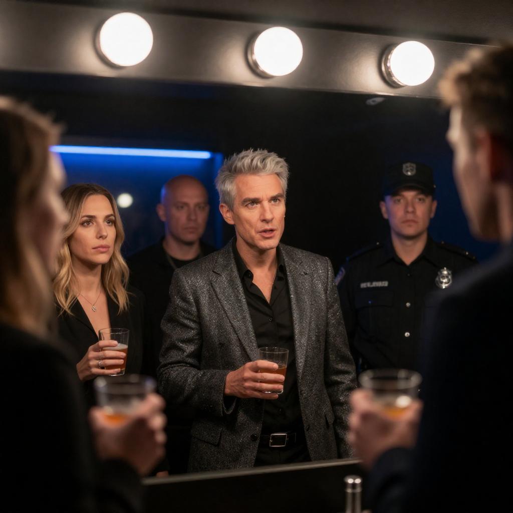 A man with styled blonde hair wearing a blue shirt and yellow tie speaks into a microphone on stage. He stands in front of four men dressed in various plaid suits and shirts. The background is wood-paneled, and the group has neutral expressions. A silver tray is partially visible on the left side of the image.