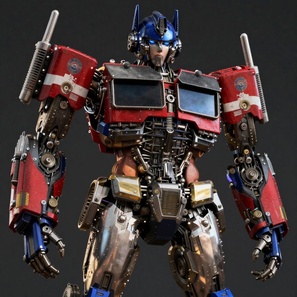 Highly detailed hyper-realistic rendering of a female Transformer robot inspired by the Autobot design. The robot features a metallic blue and red exterior with intricate mechanical components, shining and reflective surfaces, and a humanoid face with glowing blue eyes. The design blends futuristic robotics with vintage car elements, showcasing both strength and precision in a striking pose against a dark background.