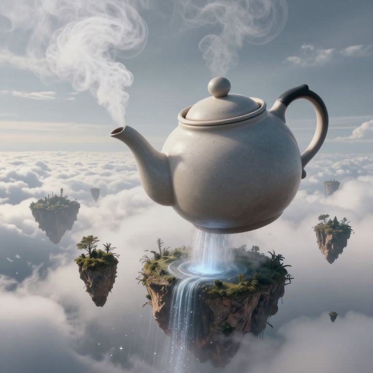 A colossal, levitating teapot steams into the clouds, pouring out a river of stardust that nourishes floating islands.