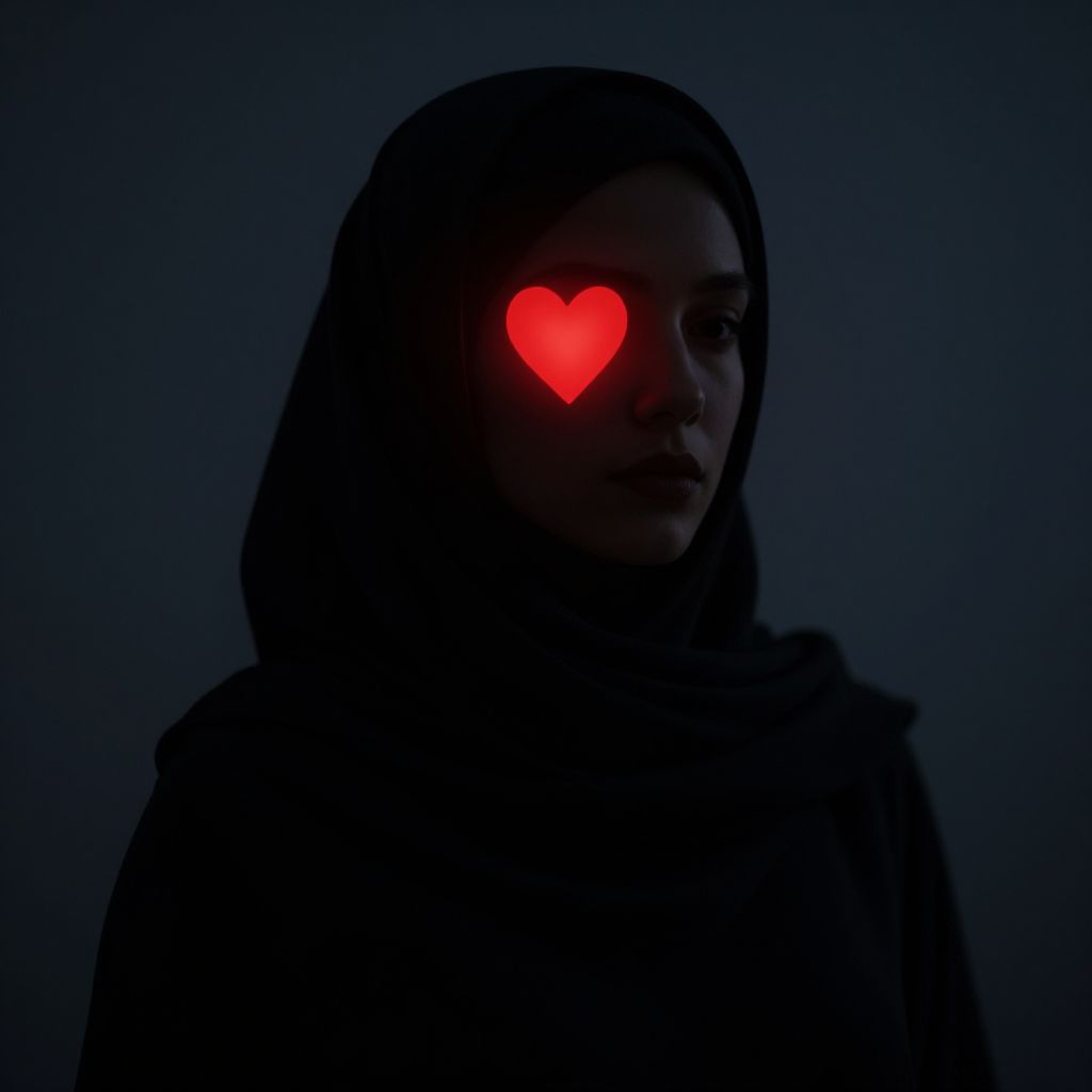 An enigmatic silhouette of a woman in a headscarf, adorned with a glowing red heart, evokes a profound sense of inner strength and resilience, symbolizing the enduring spirit of love and identity amidst the quiet whispers of solitude.