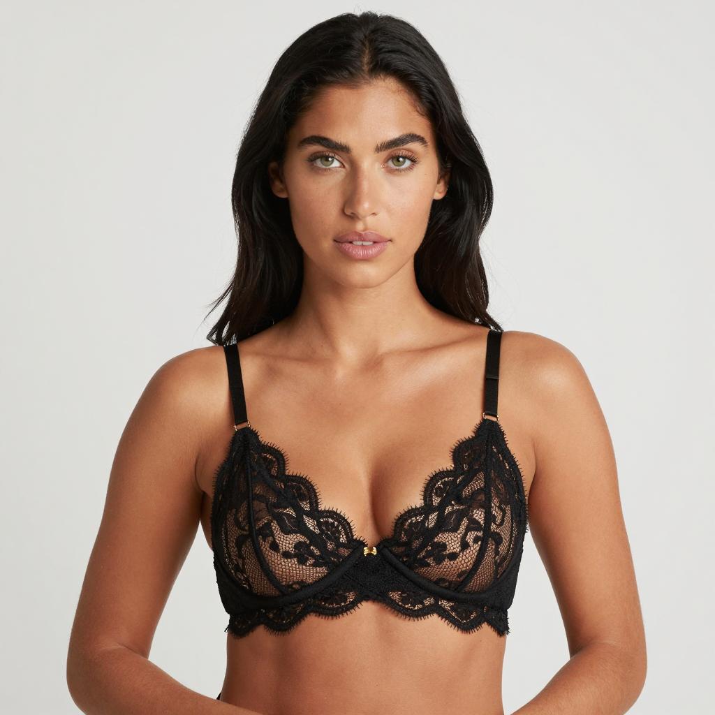 Photograph of a woman with light olive skin, long black hair, and green eyes. She wears a black lace bra with thin straps and small gold accents. Her arms are crossed over her stomach. She has a neutral expression with slightly parted lips. The background is plain white. She looks directly at the camera.