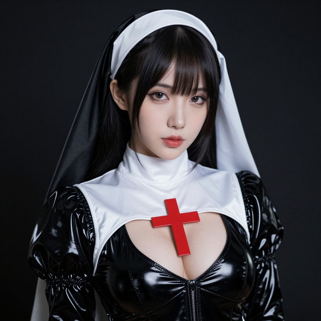 Photograph of an East Asian woman with long black hair and bangs, dressed in a shiny black latex nun outfit with a white veil and cross. The outfit has a deep neckline revealing significant cleavage, and a red cross on the chest. She has pale skin, red lipstick, and a neutral expression. The background is dark, creating a stark contrast with her outfit.