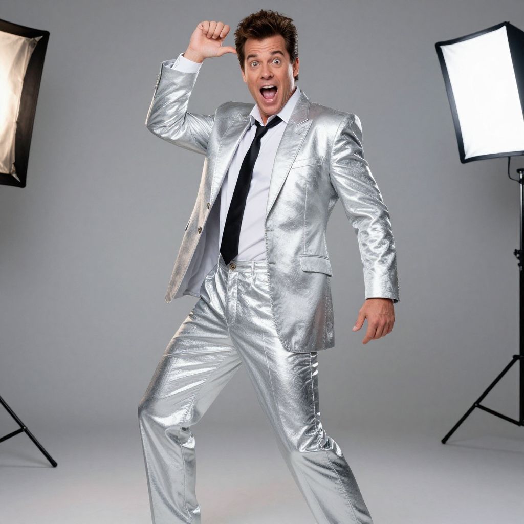 Zoolander silver suit, playful and exaggerated fashion portrait of a man in a shiny silver suit with a flamboyant pose, 80s inspired bright colors, studio setting with softbox lighting, glossy magazine cover aesthetic, dynamic and bold