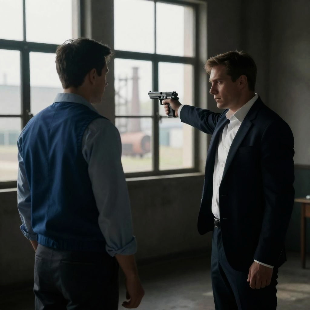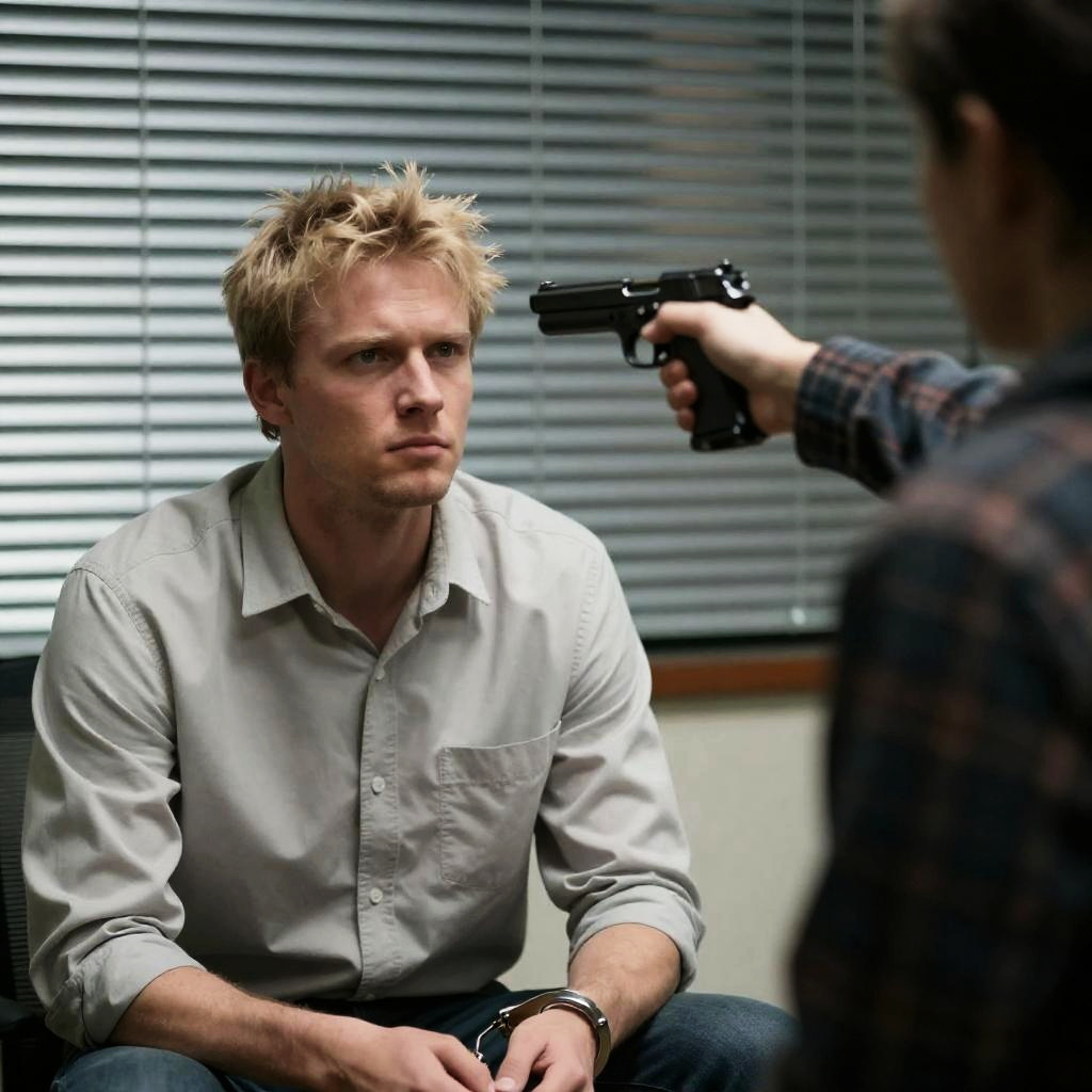 Photograph of two people in a tense standoff. Blonde man with scruffy hair, wearing a light shirt, sits holding a handcuff. Opposite, person in a plaid jacket points a gun at him. Background: horizontal blinds. Intense expressions.