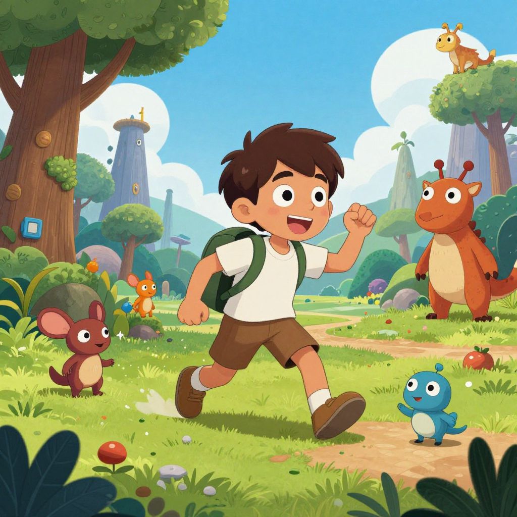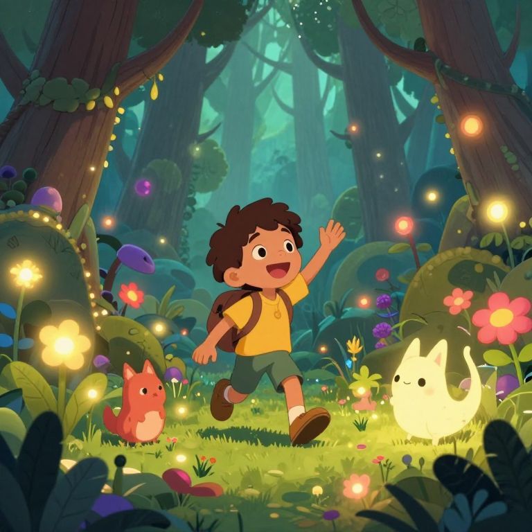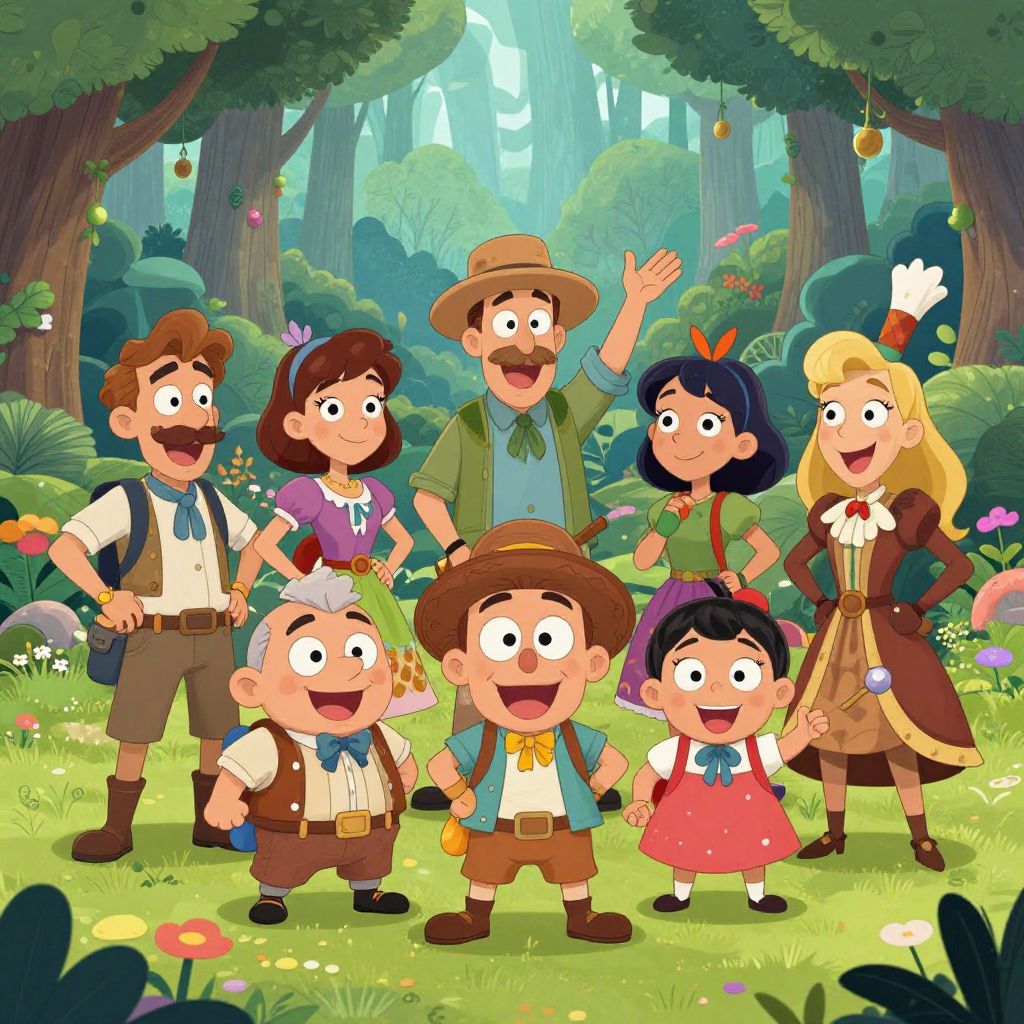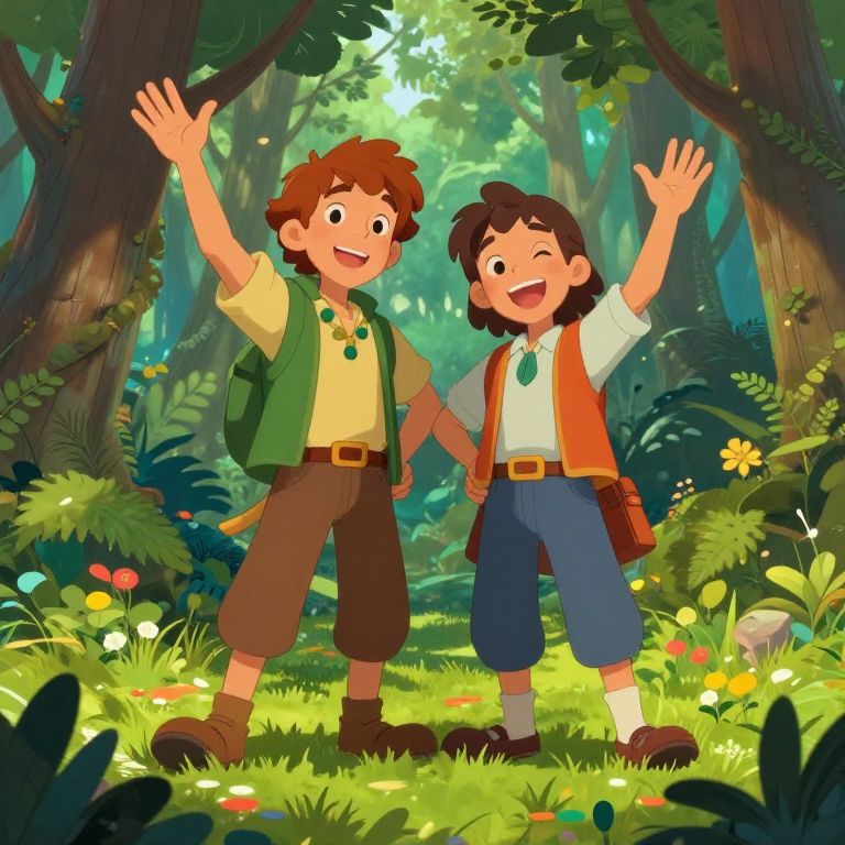 Gaston and his friend standing triumphantly in a lush forest clearing, vibrant colors, detailed expressions, fantasy style, dynamic lighting, whimsical atmosphere
