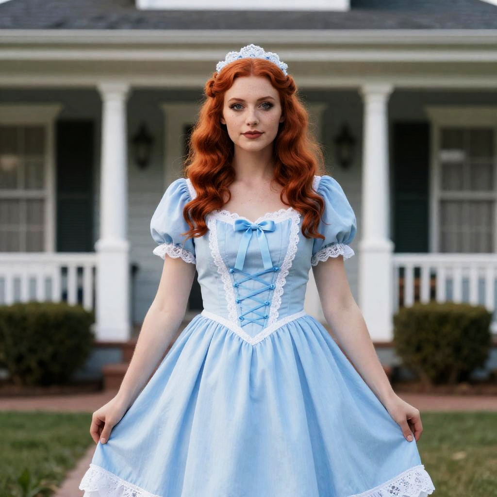 Dorothy Halloween Costume Woman, woman with red hair and blue dress standing in front of a house
