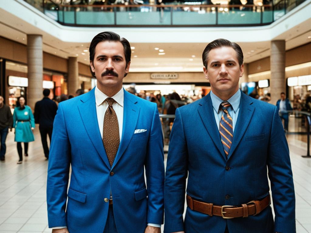 Movie Fancy Dress Male face swap, man in a blue jacket and brown pants standing on a sidewalk