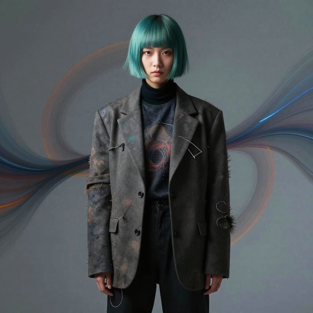 Photograph of an Asian woman with a chin-length, vibrant turquoise bob haircut. She wears a dark, textured, patterned blazer over a black, abstractly patterned turtleneck. Her expression is neutral, and she stands against a gradient gray background with swirling, multicolored light patterns in blue, red, and orange. The blazer has intricate, geometric designs, and she stands centered in the frame, exuding a modern, edgy style. The lighting highlights her hair and the textures of her clothing.